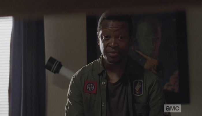 Back in the bedroom, Tyreese continues to lose more blood as his skin begins changing blue. Sweat pours from his forehead as his eye pupils dilate. The hallucinations become more vivid and rapid. Tyreese witnesses Lizzie and Mika telling him that it is okay to let go. Beth comes into the picture while singing and playing on an acoustic guitar. Her lullaby is soothing but we know that Tyreese is close to death. Bob, Martin share more debates on Tyreese’s former actions. Lastly, the ghostly Governor tries intimidating Tyreese by showing him photo slides of his failures for revenge. The Governor yells at Tyreese for being weak in forgiving Carol after what she did. Carol in Season 4 murdered and then burned the body of Tyreese’s girlfriend in order to stop the spread of the infection at the prison. Later on that Season, Carol admits to Tyreese that she killed Karen after euthanizing Lizzie by the flowers. Tyreese faces his obstacle by admitting that he does not regret the decisions he made. He even saved Judith a few times. As a kid he would listen to the news on the radio to make sure him and his sister were out of harms way. He was always trying to do the right thing as the natural protector.