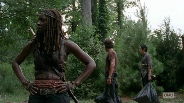 The three observe scattered pieces of walkers on the grass. Rick tells Glenn and Michonne that they can’t stay because the gates are down and they’re surrounded by open woods. Michonne disagrees and says they will cut down the trees and build a wall. Glenn is indifferent. What he does say instead is that it did not matter who killed Dawn. Michonne then blurts out that they’re better off trying to go to Washington D.C., which is about one hundred miles North. Rick agrees with Michonne because even though Eugene was lying about a cure, there must be some reason why he chose to label D.C. as the imminent destination.