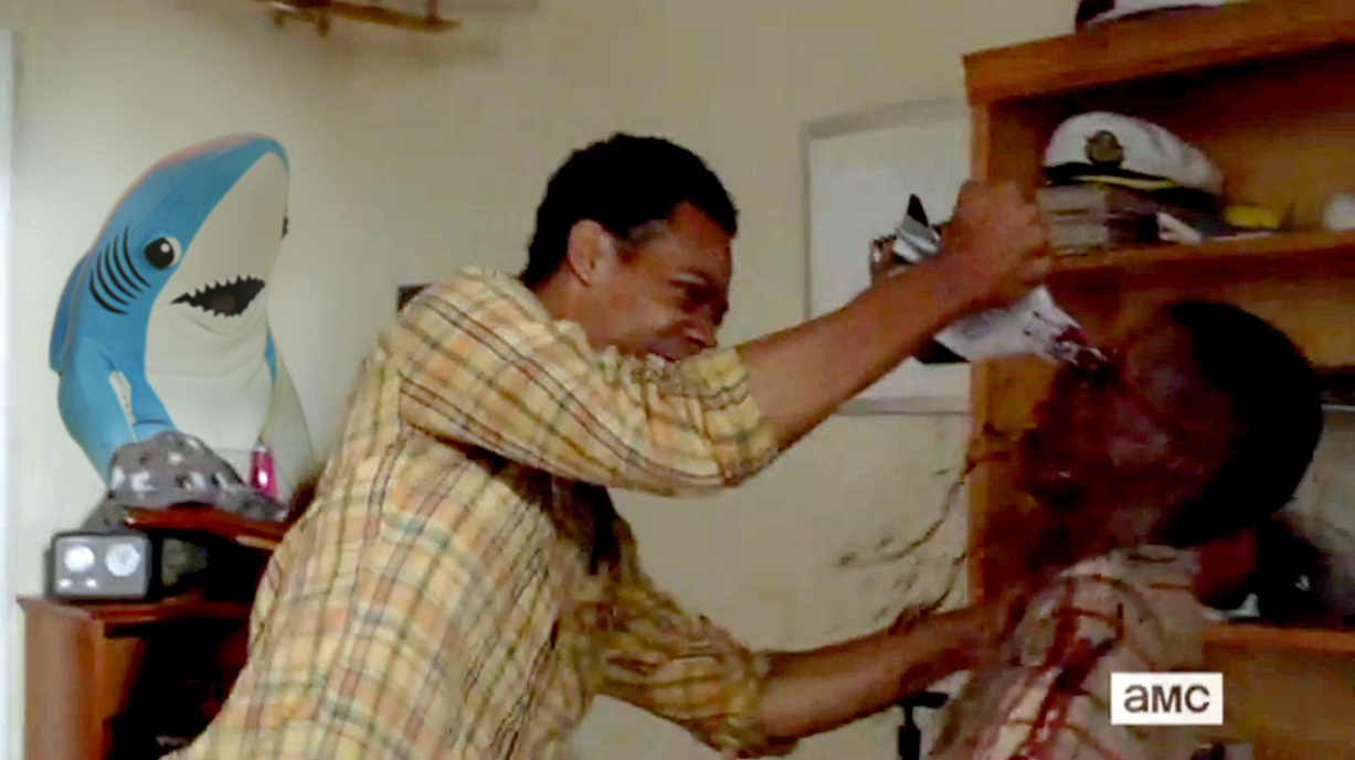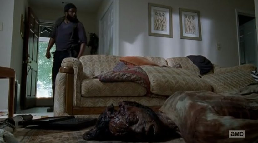 The Governor suddenly appears to Tyreese as a walker. This alarm shakes Tyreese out of his mental state when he struggles to fend himself off. With no one around to help, Tyreese uses his already bit arm as a distraction so he could grab something sharp around the room. He quickly manages to push the walker onto a desk chair as he nails a sharp edge through the back of it’s head. Tyreese hides himself under a table as he puts pressure on his wounds while also losing more blood. A painted picture of a framed farm house becomes drenched with blood on the floor. Is the farm house a recalling to the Grove, from last season? The same place where Lizzie and Mika passed away? Possibly.