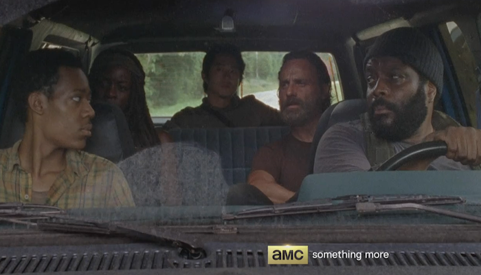 Present day, Rick is driving a blue van along with his passengers: Noah, Michonne, Glenn, and Tyreese. Rick is communicating to Carol via walkie-talkie. So this means that the other half of the group is possibly a few miles away, not too far. We soon realize that Rick was taking Noah to his neighborhood. Being extra cautious, due to traumatic experiences they had on former settlements (Terminus, Woodbury, CDC, the list goes on…) Rick parks the vehicle next to a group of abandoned cars as camouflage, whilst a walker (sorry can’t say zombie) squawks in her seat.