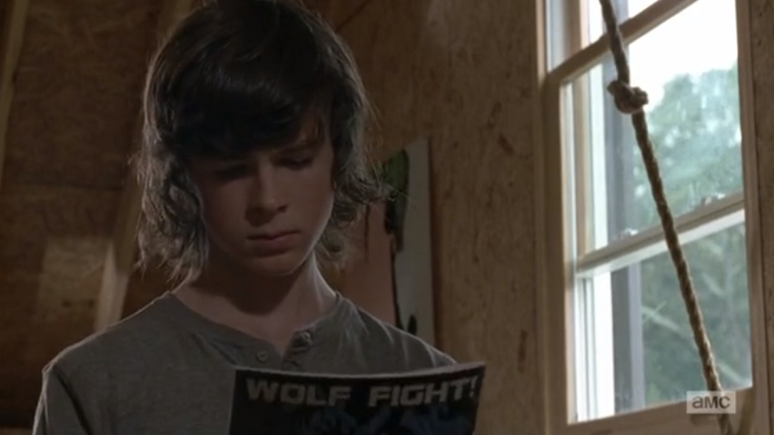 Rick and Carl enter one of the furnished dwellings and are nearly numb by its beautiful presence. Rick decides to finally take a warm shower. Carl explores the upstairs. Carl’s own preemptive instinct is to attack as he hears a screeching from one of the doors while raising a sharp dagger to his shoulder. The door opens up to a children’s attic, with painted water color images and bright patterns. Carl picks up a comic book. That was a close one. Lucky for their sake, it wasn’t a chamber of decaying corpses. Which in this world is more predictable than just having a normal room.
