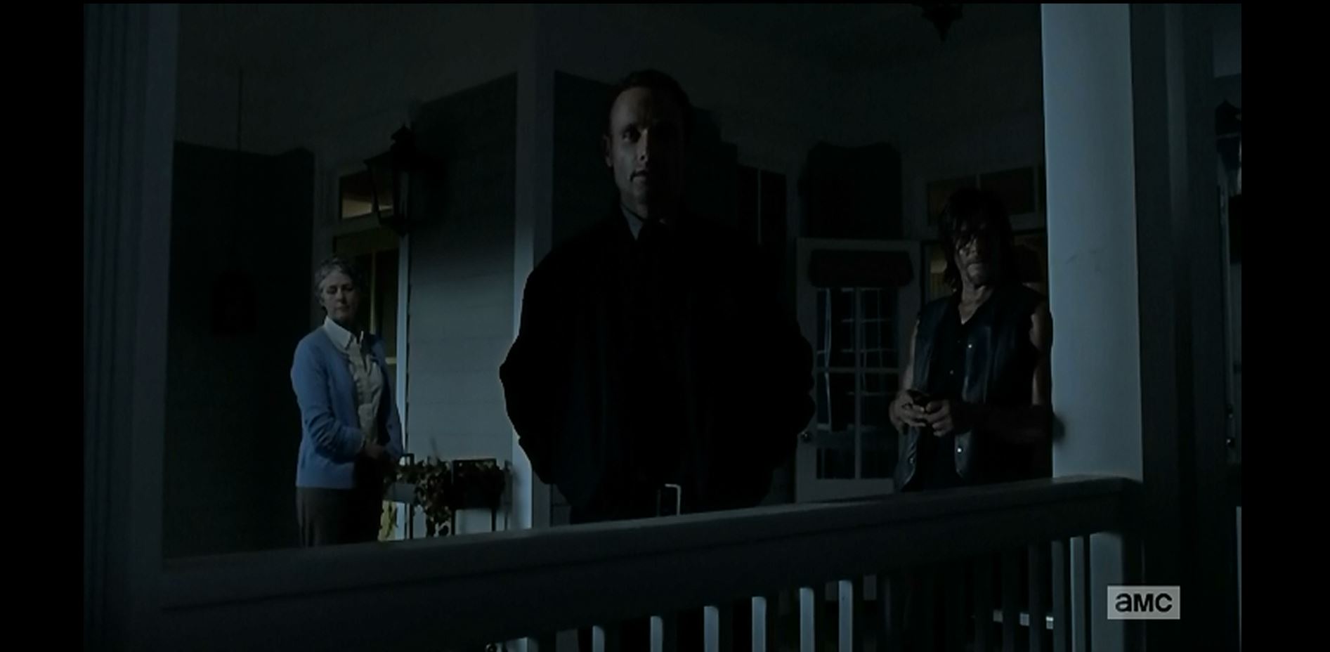 Back at the new Grime’s house, Rick walks onto the porch carrying Judith and sees Carol, Daryl, and Carl outside. Rick is now wearing a white t-shirt and his signature black pants, boots, and black belt buckle. Daryl decides to gut the possum he took out earlier with his crossbow. Rick walks around the house and confines in Daryl that the community is trying to split them up. Rick tells Daryl that they will all sleep in the same house that night.