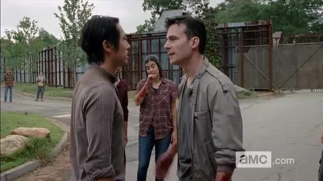 When the supply party returns to Alexandria there are discrepancies. Aidan tells Glenn that him, Tara, and Noah aren’t ready nor suited for supply runs. Glenn disagrees and says that Aidan and Nicholas are the ones who are amateurs. Aidan then gets in Glenn’s face and pushes him. Glenn replies, “you don’t want to do that man, just walk away.” Before I said to myself, “Will someone punch this guy already?” Aidan goes to swing at Glenn when Glenn quickly dodges and counters with a punch, knocking Aidan on his feet. Before Nicholas can pounce on Glenn, Daryl chimes in and tackles him to the ground. Rick runs to Daryl and pushes him off Nicholas. “We can’t do this again,” Rick screams at Daryl. This scene reminded me of when Rick had to hold Daryl back from kicking the crap out of the teenage Vatos gang member back in Season 1. And Glenn is a total ninja bad-ass, pulling fast reflexes.