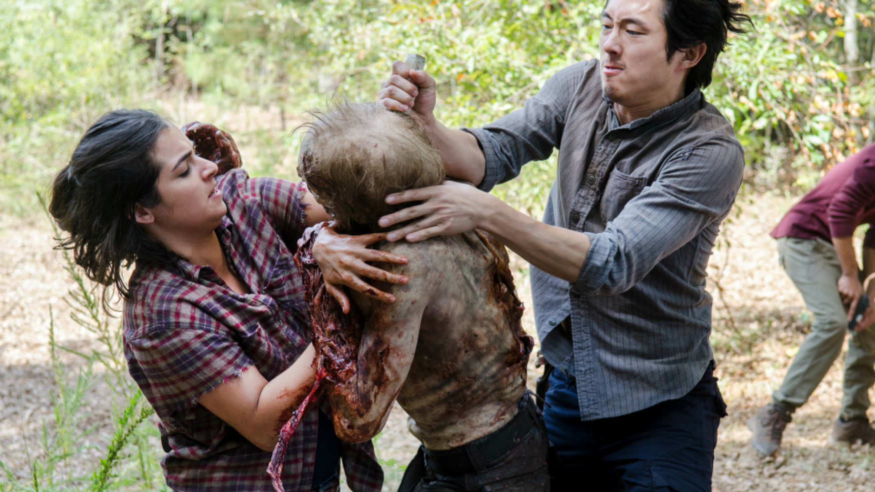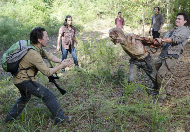 Glenn seems to be a bit opposed to Aidan’s ruling when they take them outside the walls. Especially, when Aidan reveals to the group that they’ve kept one walker chained to a tree. They did this because they wanted to get revenge on the walker for killing their last supply runners. When the five get to the tree, the walker is gone, but the chain is dangling loosely from the branch. Aidan and Nicholas begin to call out and whistle knowing that the walker is nearby. Glenn, Tara, and Noah immediately try to quiet Aidan and Nicholas down. The walker approaches as Aidan attempts to grab it and wrap the chains around it. Aidan struggles as the walker fights him, Tara pitches in. Tara winds up peeling the walker’s skin on its upper back as it caves off like rubber. The walker then lunges towards Tara and desperately tries to bite at her until Glenn steps in and stabs his knife through the walkers decaying head.